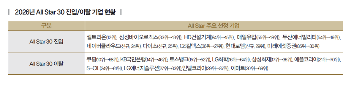 2026년 새롭게 All Star 30에 이름을 올린 기업들은 셀트리온, 삼성바이오로직스 등 바이오 섹터와 현대로템, 두산에너빌리티, HD건설기계 등 방산·플랜트·건설