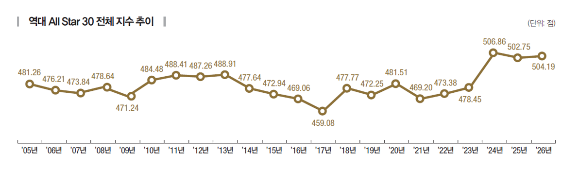 2026년 All Star 30 기업의 평균 지수는 504.19점을 기록했다. 이는 지난 2024년 500점대(506.86점)에 진입한 이래, 3년 연속 그 수준을 유지하고 있음을 보여준